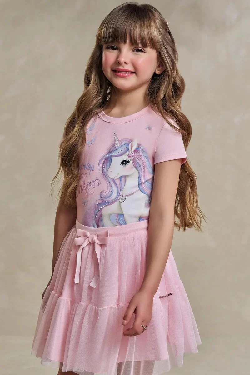 Blusa em Cotton Rosa Unicórnio Infanti Infantil Menina
