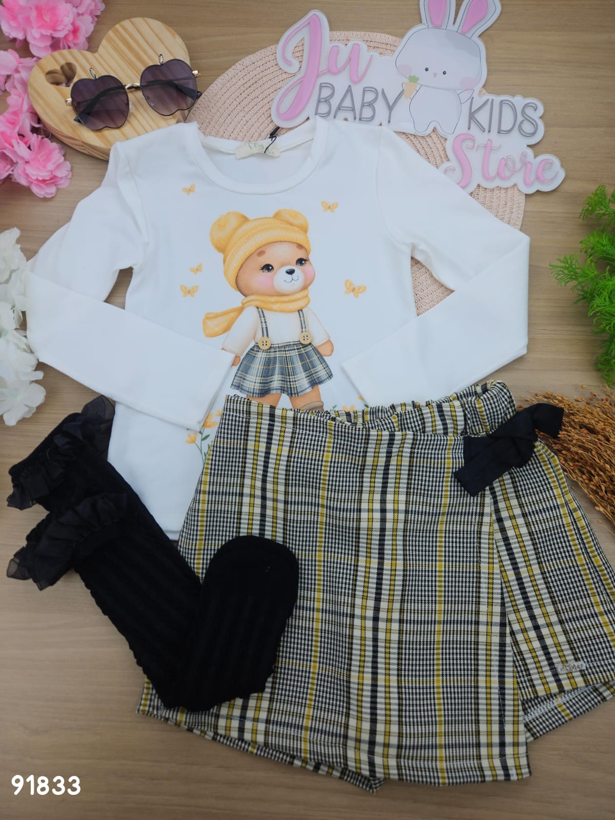 Conjunto de Blusa em Cotton com Shorts Saia em Alfaiataria Xadrez