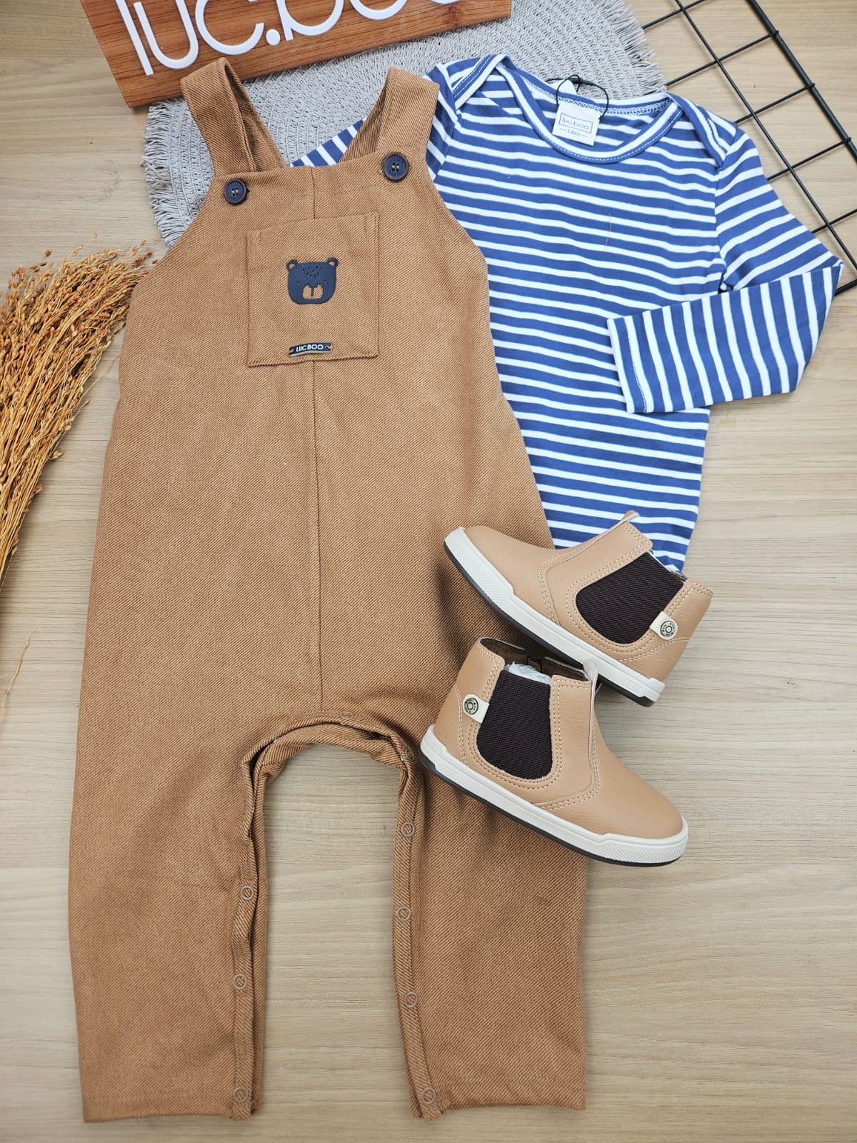 Conjunto Body Manga Longa E Jardineira Alca Bege Escuro Lucboo