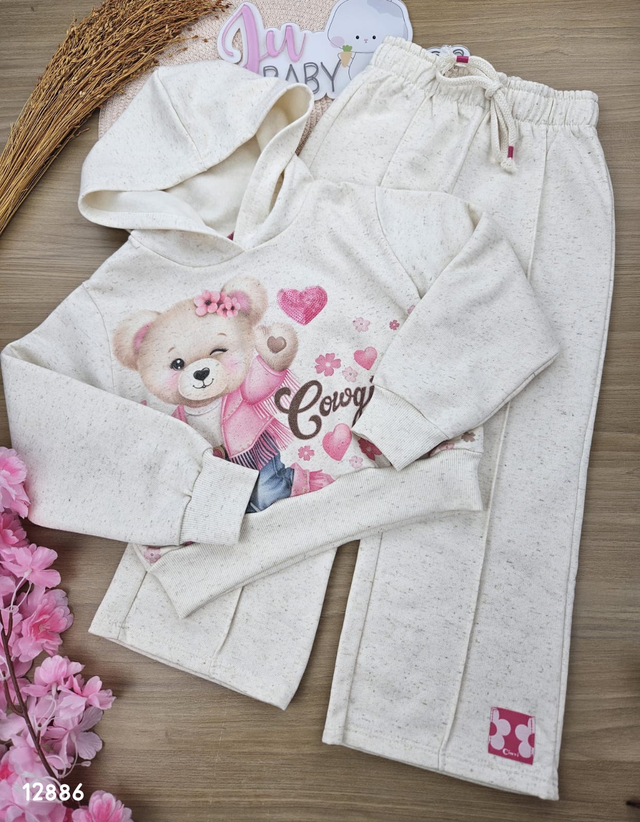 Conjunto de Blusão e Calça de Moletom Peluciado Ursinha Cowgirls Off White Cinti