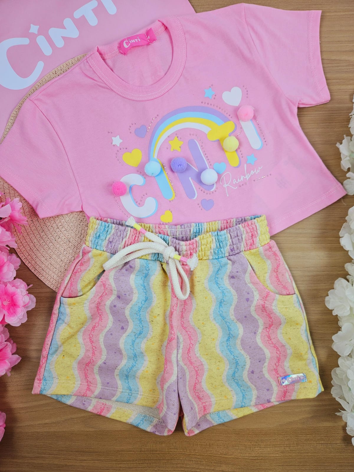 Conjunto Arco-íris Blusa Boxy Algodão e Short Moletom Linho Cinti