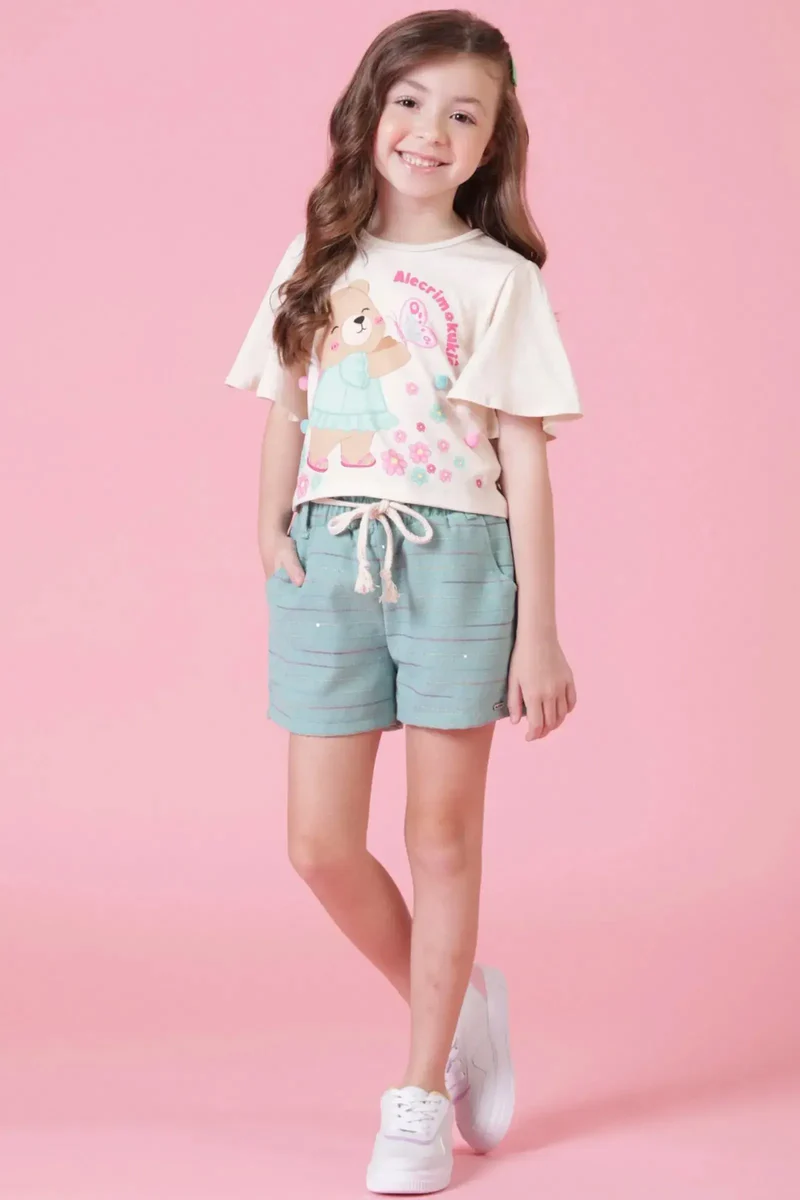 Conjunto de Blusa Boxy Over em Malha Power e Shorts em Linho Rajado Kukiê Infantil Menina