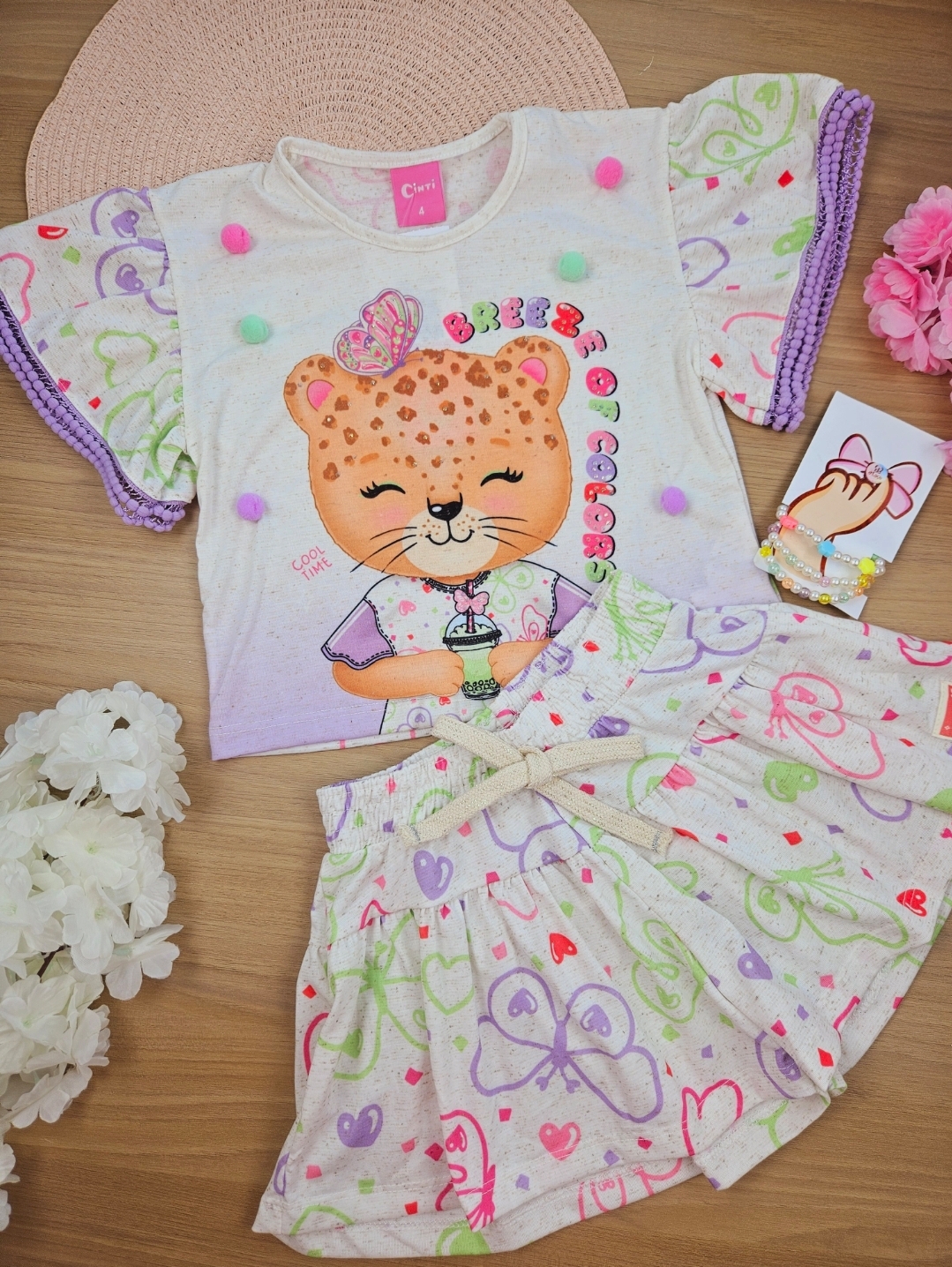 Conjunto Blusa Oncinha Boxy E Short Borboletas Off White Cinti