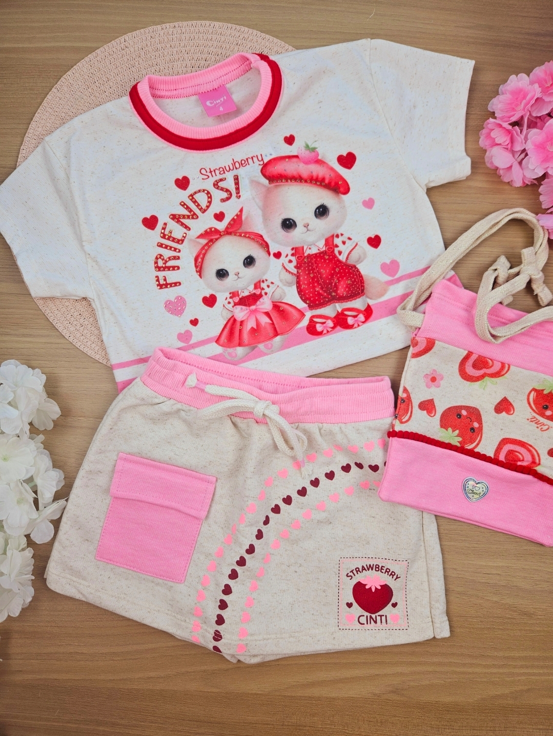 Conjunto Menina Blusa Gatinha, Short-Saia e Bolsa Off White e Rosa | Cinti