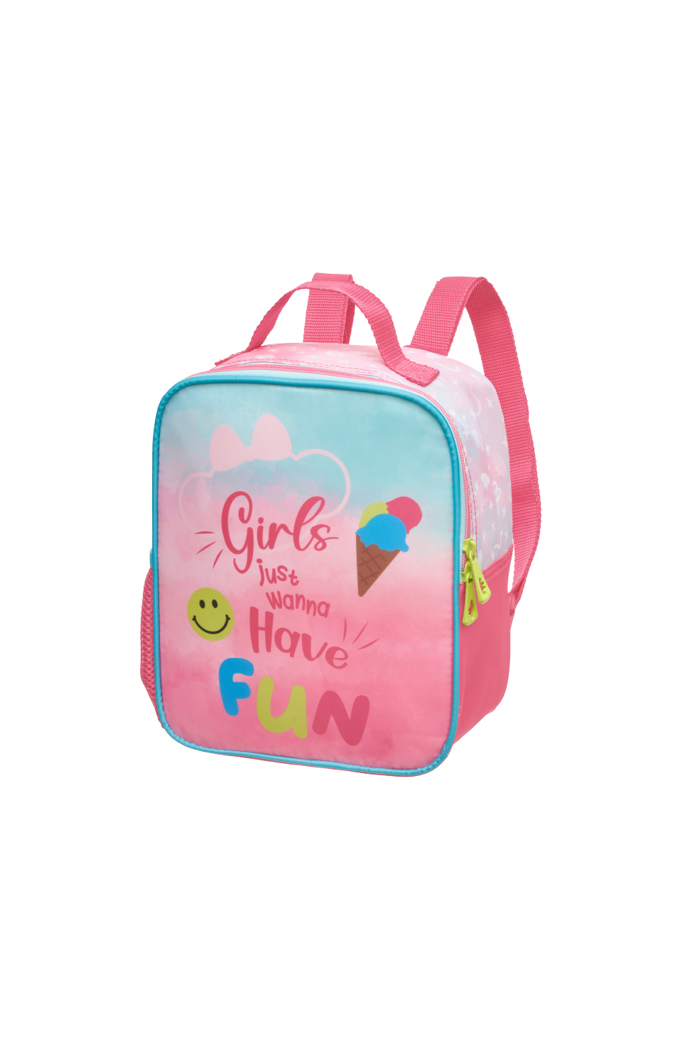Coleção confeccionada em poliéster com estampa degradê em tranfer. Patches de paetês e log em silkscreen de glíter. Puxadores de zíper em metal colorido, bolsos laterais de paetês com elástico. Costas personalizadas com pespontos e etiqueta bandeira emborrachada nas alças de ombro.