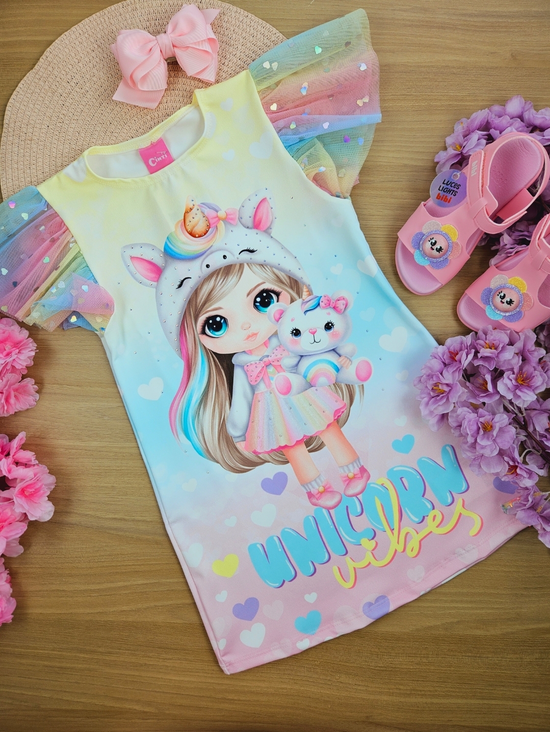 Vestido Infantil Menina Unicórnio Azul Cinti